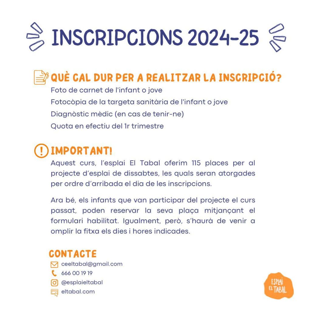 Arriba el setembre i amb ell les inscripcions per al nou curs de dissabtes! Us hi esperem a tots i totes al local de l’Esplai el Tabal, situat al parc de Sant Jordi.