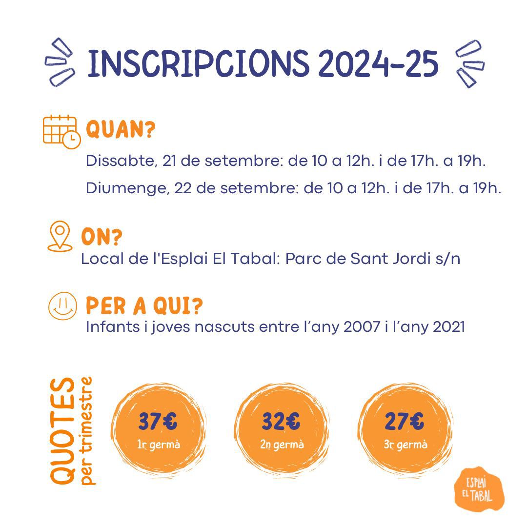 Arriba el setembre i amb ell les inscripcions per al nou curs de dissabtes! Us hi esperem a tots i totes al local de l’Esplai el Tabal, situat al parc de Sant Jordi.